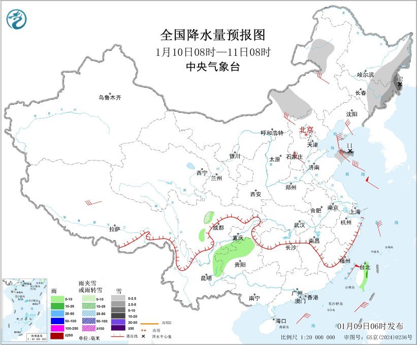 全国降水量预报图(1月9日08时-10日08时)