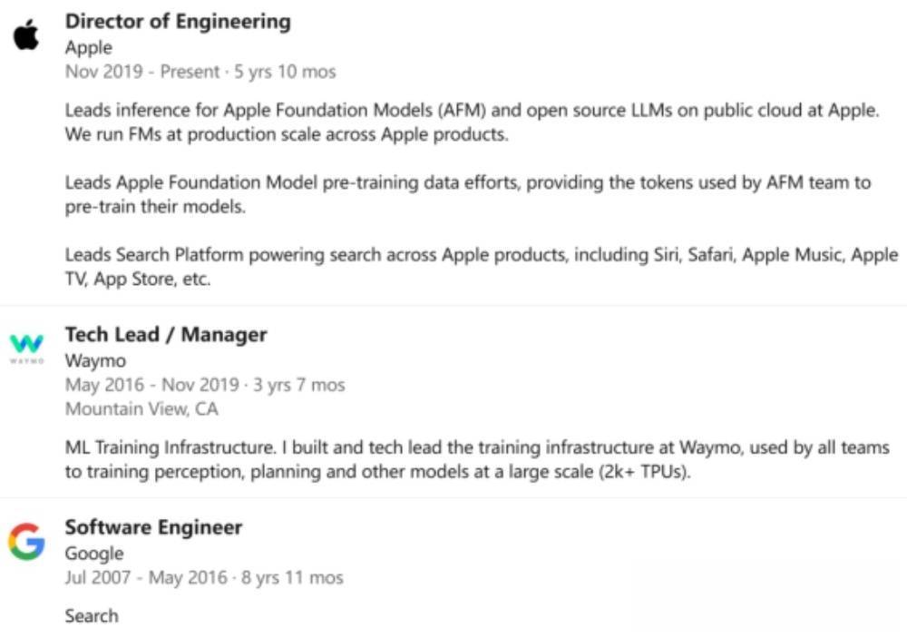 毕业后他曾加入谷歌工作了11年,是早期谷歌大脑团队的成员。2019年,他加入苹果,担任机器学习高级总监,负责AI搜索与问答系统。