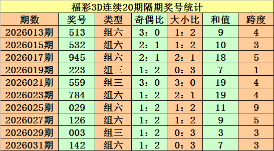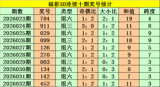 上期回顾:福彩3D第2026032期奖号:452。组六、小大小、偶奇偶。